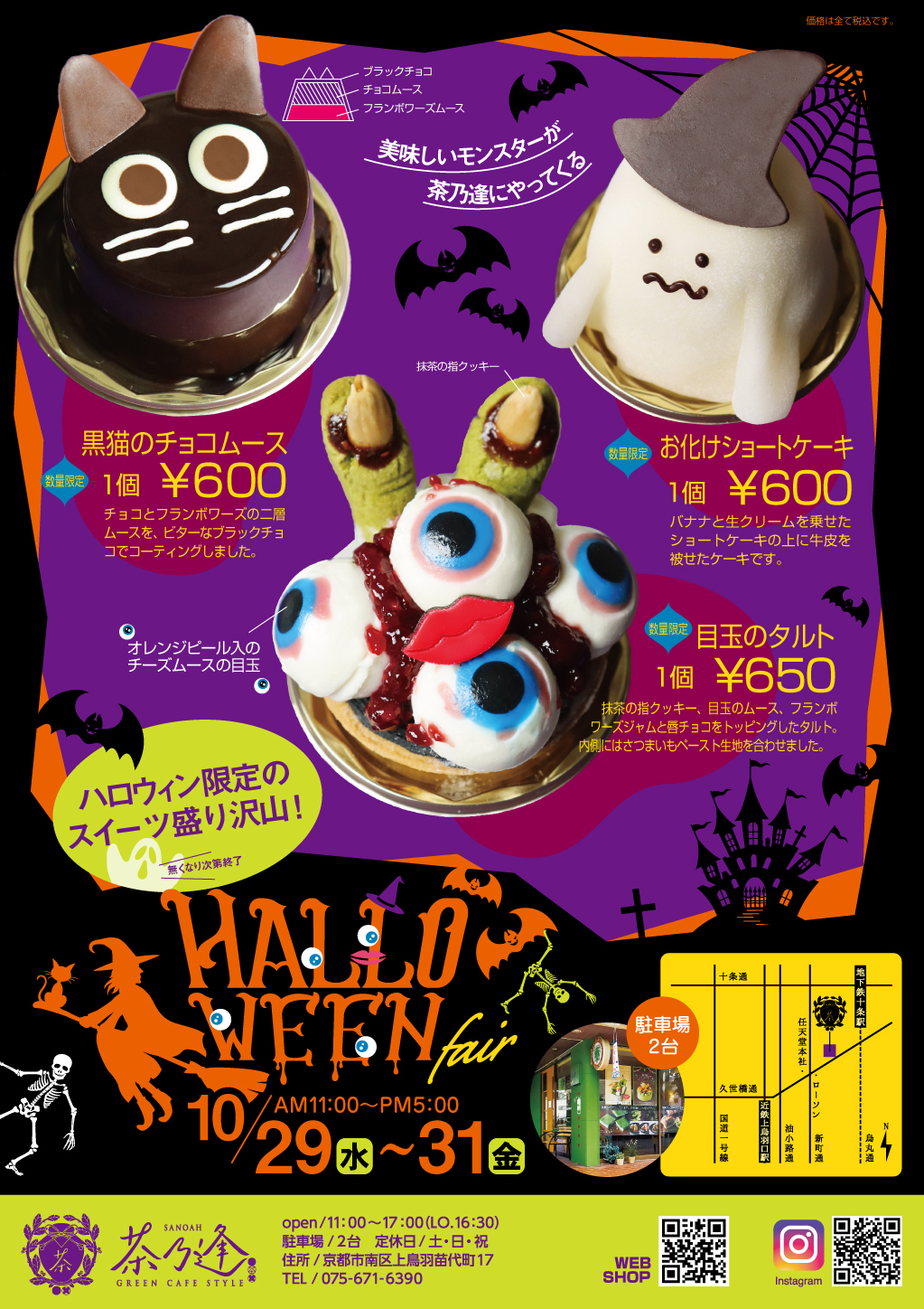 2025.10.14 ハロウィンフェア開催のお知らせ 2025年10月29日(水)・30日(木)・31日(金)にGREEN CAFE STYLE 茶乃逢では「ハロウィンフェア 2025」を開催します。 今年も期間限定のハロウィン限定ケーキや焼菓子をご用意! 今年も不気味なハロウィンスイーツを準備してお客様のお越しをお待ちしております!限定商品のため、売切れの場合がございますので、お早めにお買い求めください! 雨天決行ですが、急激な天候の変化等が発生した場合は中止いたします。 10%オフクーポンは、2025年10月29日(水)、30日(木)、31日(金)のみ有効です。特価品(福袋)にはご利用になれません。 商品は十分にご用意いたしておりますが、売り切れの際はご容赦くださいますよう、お願いいたします。 茶乃逢スウィーツフェア 最近のお知らせお知らせ一覧 2025.09.11 茶乃逢スウィーツフェア 2025.07.22 8月15日(金) 臨時休業のお知らせ 2025.03.14 8周年感謝祭 いちごスイーツフェア 2025.02.05 茶乃逢スイーツフェア 2025年2月 2025.01.23 訳あり工場直売フェア
