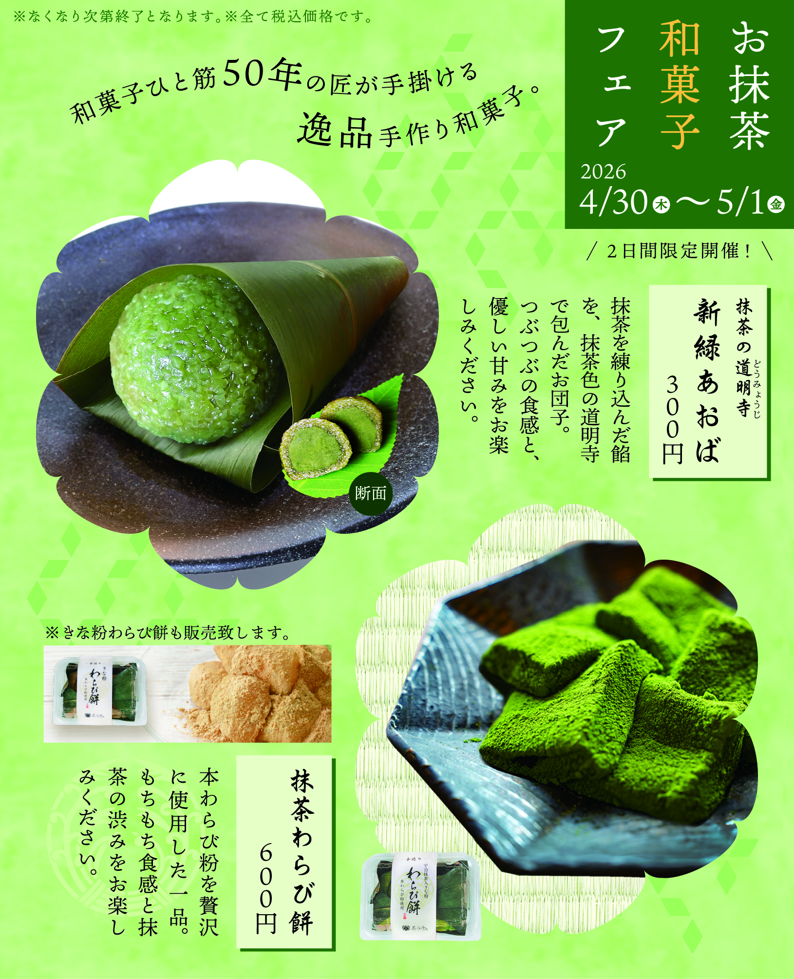 2026年4月30日(木)〜5月1日(金)11:00~17:00に GREEN CAFE STYLE 茶乃逢では、お抹茶和菓子フェアを開催いたします!抹茶の道明寺と抹茶わらび餅などをご用意!皆様のお越しをお待ちしております!