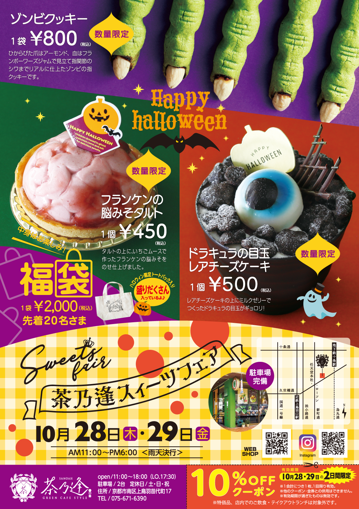 2021.10.21 茶乃逢スイーツフェア 10月 2021年10月28日(木)・10月29日(木) 11:00~18:00 GREEN CAFE STYLE 茶乃逢店舗前で、茶乃逢スイーツフェアを開催いたします!特設テントを設置して皆様のお越しをお待ちしております。 雨天決行ですが、急激な天候の変化等が発生した場合は中止いたします。 10%オフクーポンは、2021年10月28日(木)、29日(金)のみ有効です。特価品(福袋)にはご利用になれません。 商品は十分にご用意いたしておりますが、売り切れの際はご容赦くださいますよう、お願いいたします。 茶乃逢スイーツフェア 9月 茶乃逢スイーツフェア 12月 最近のお知らせお知らせ一覧 2025.11.21 クリスマスケーキご予約受付中 2025.10.14 ハロウィンフェア開催のお知らせ 2025.09.11 茶乃逢スウィーツフェア 2025.07.22 8月15日(金) 臨時休業のお知らせ 2025.03.14 8周年感謝祭 いちごスイーツフェア